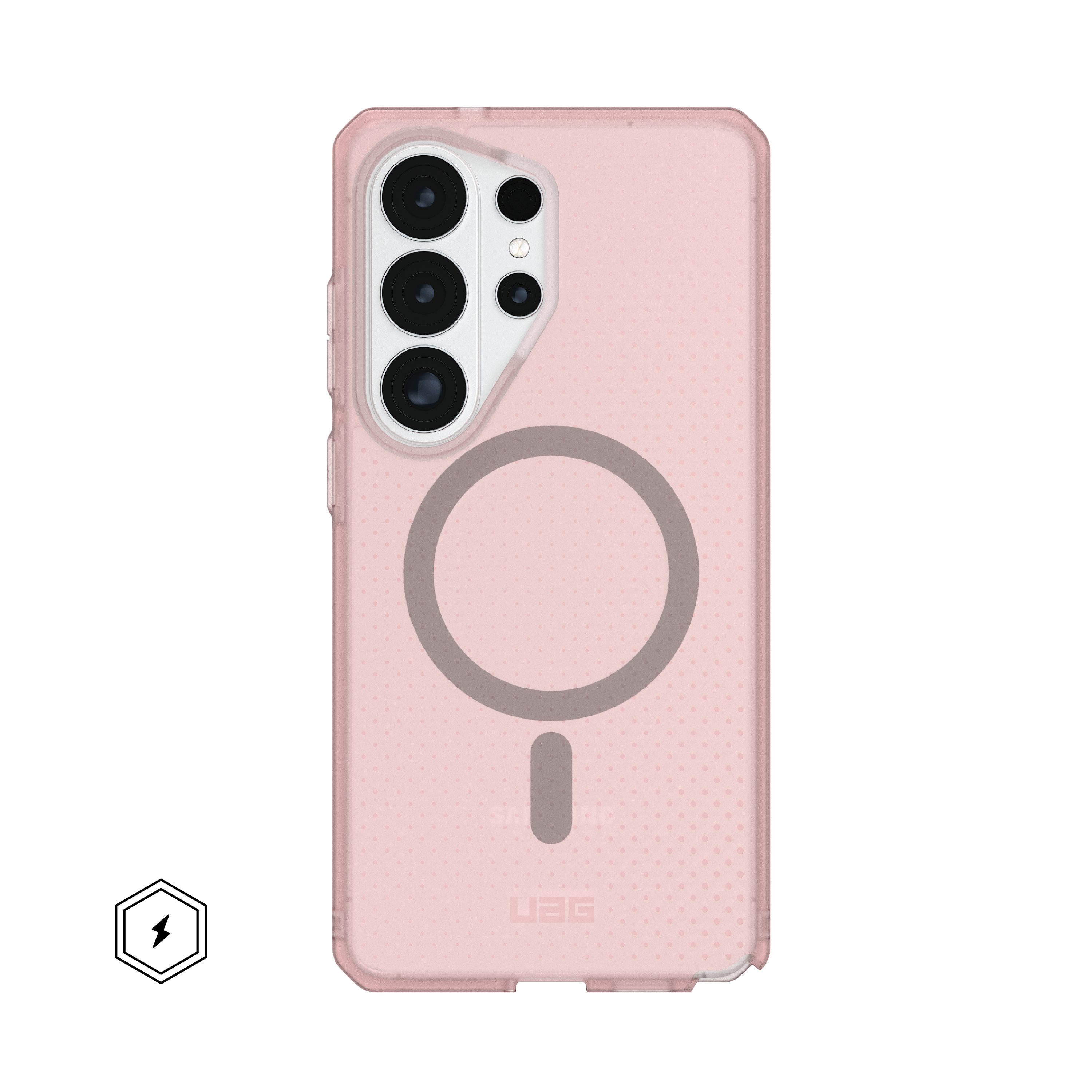 The Dot series is an opaque, lightweight case that offers exceptional military drop protection, trusted and loved by UAG. Crafted with a rugged co-mold of translucent PC and TPU, it features an advanced impact-resistant core and a raised protective screen surround to guard your device against drops and scratches. Our integrated magnet module locks your device securely in place when using wireless chargers or other magnetic accessories. Features an enhanced textured anti-slip traction grip that ensures a secure hold, reducing the chance of accidental drops.