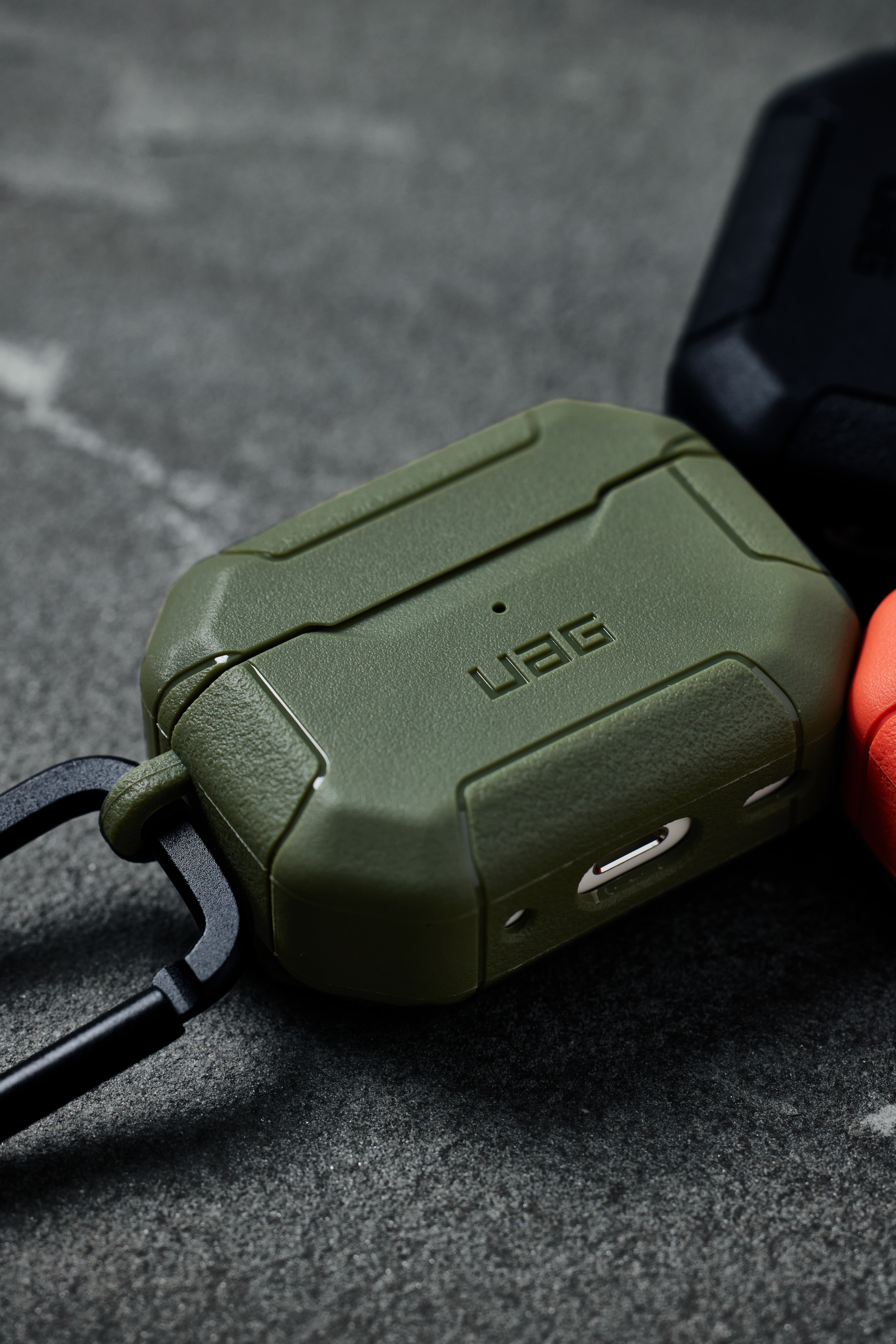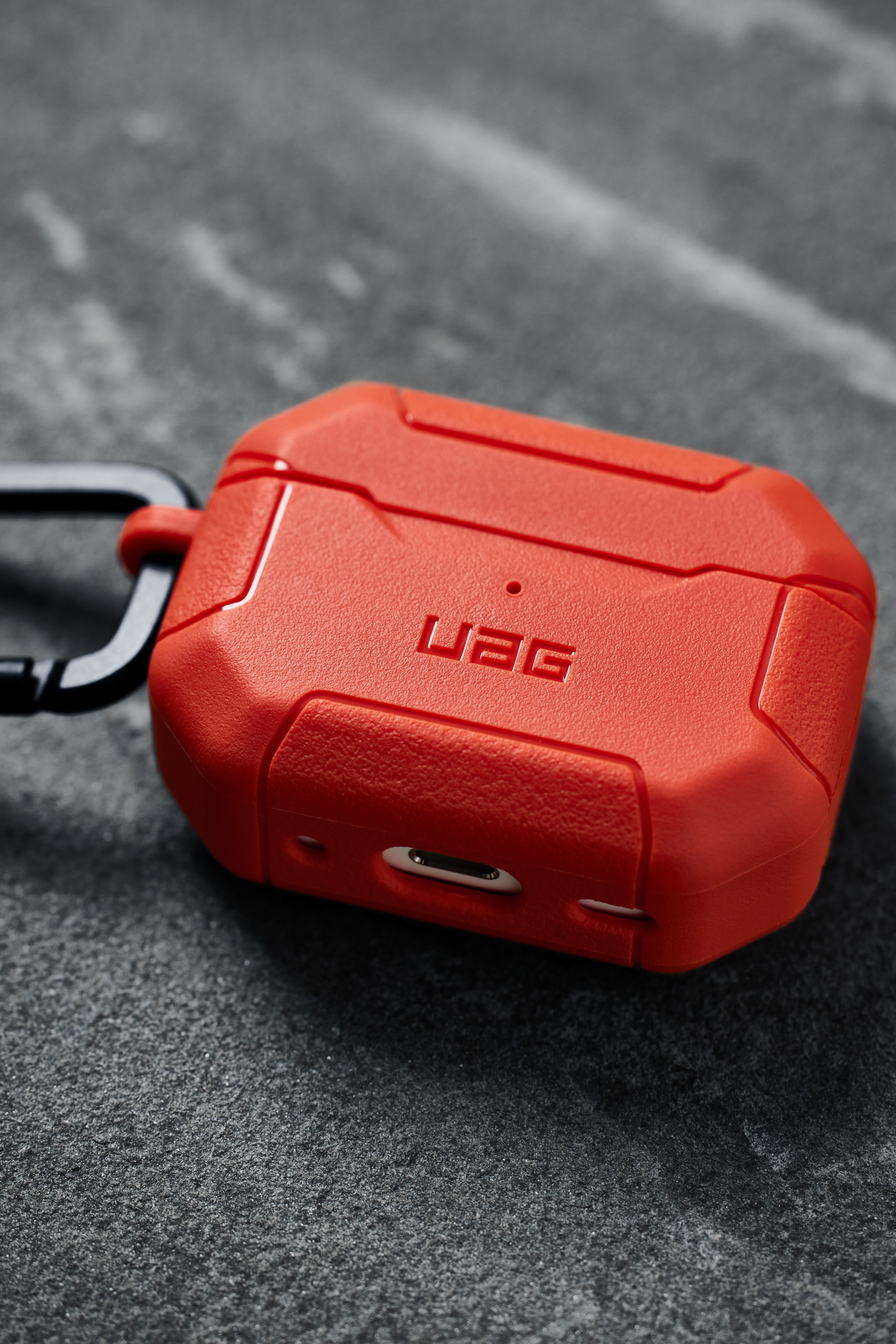 The Scout Series is here to protect your AirPods from your daily adventures and further. Featuring smooth channels, distinguished bumpers, and UAG brand detail this case has a rugged look along with serious protection. With a durable 2-piece military drop tested TPU construction designed to shield your AirPods from drops and scratches. Heavy grip textured bumpers provide a non-slip grip. Easy and full access to the lighting port. Wireless charging compatible with most 3rd party chargers without removing the case. Convenient detachable carabiner clip so you can securely take your AirPods on the go. Tackle every day with ease knowing your AirPods are secured and safe from the elements.